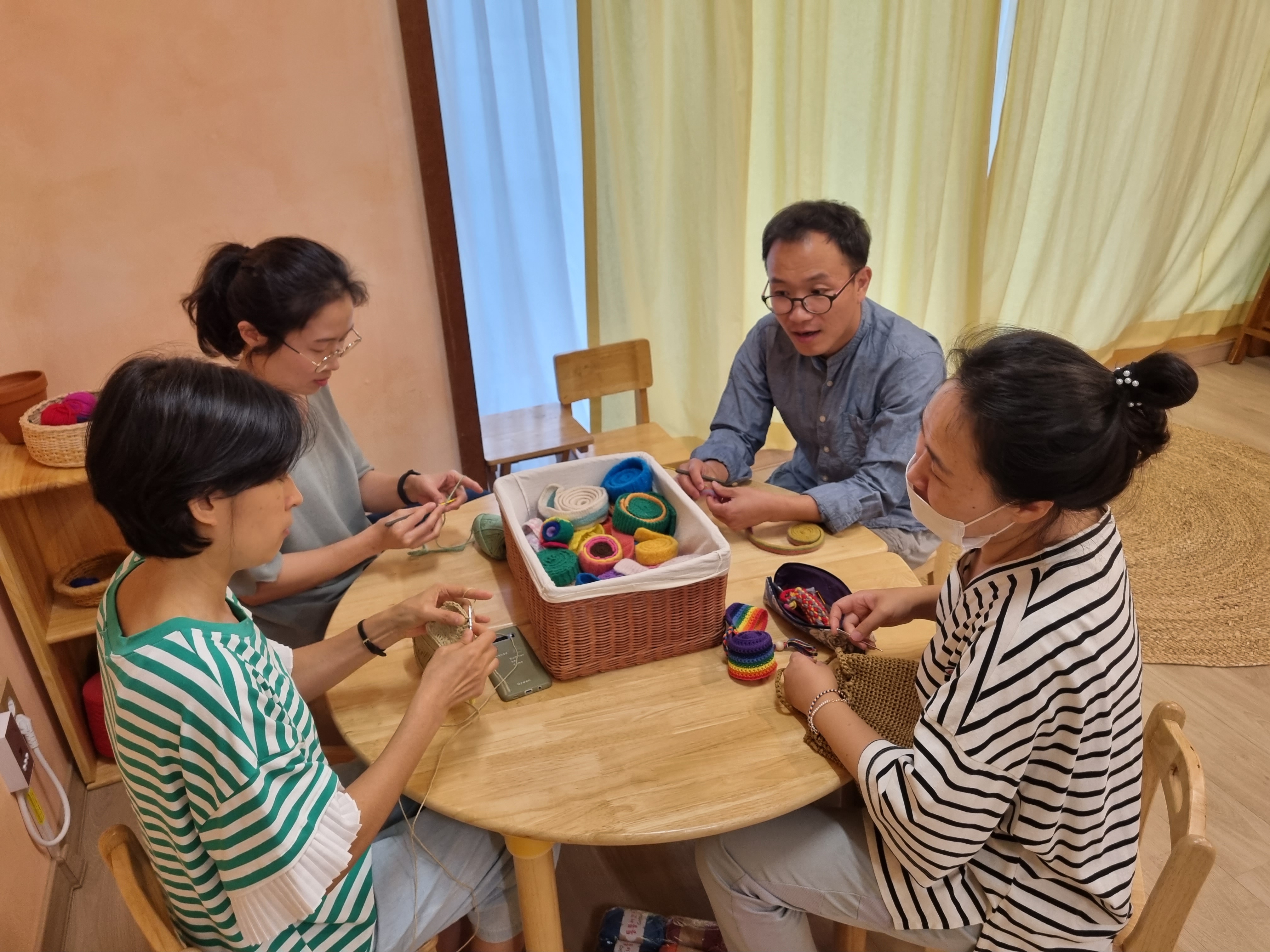 무지개달팽이끈 만들기 시작, 기초반은 기초 사슬뜨기, 짧은 뜨기 연습하며 달팽이끈 길이 늘리기, 중급반은 가방뜨기 이어가기