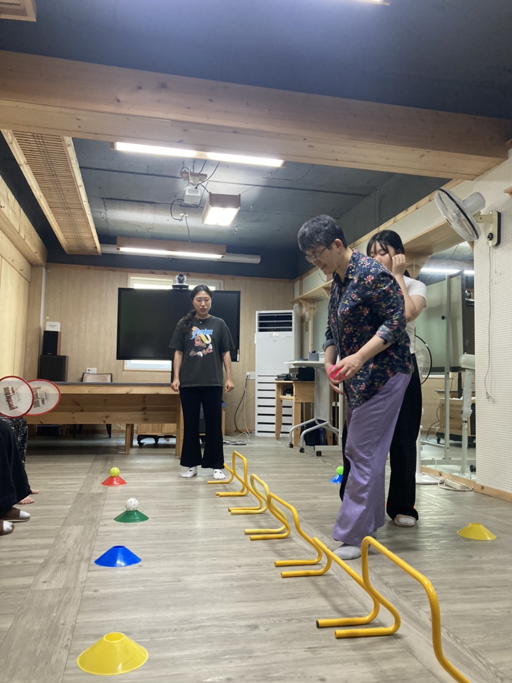 코어운동과 균형잡기 운동, 상체운동, 협업운동으로 놀이체육 진행, 날씨가 더워 운동 후 수분보충함.